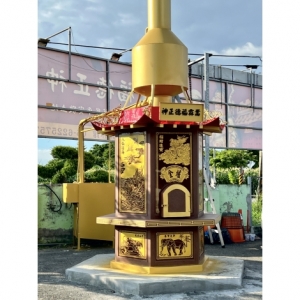 R4.1 | 多功能自動化環保金爐(附有水夾層) | 六角形造型 主色調使用樸實無華且質感爆棚的「大地色石礫漆」可在爐體金屬表面創造逼真自然的岩石外觀,使金爐在質感上有更多豐富的視覺與觸感效果。 +薄屋緣設計(屋頂上金花飾、下裝飾) +紅寶石花崗岩板材(石刻神話故事) +單爐門(專利水夾層爐門) +單清灰門 +廟牌 |